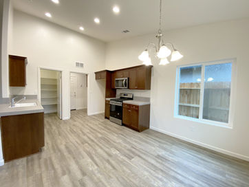 Villa Bergamo has 3 bedrooms, 2 bathrooms, a walk-in pantry in the kitchen, a dining nook, living room with vaulted ceilings and a covered backyard patio.